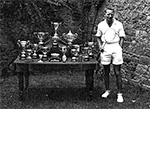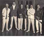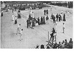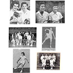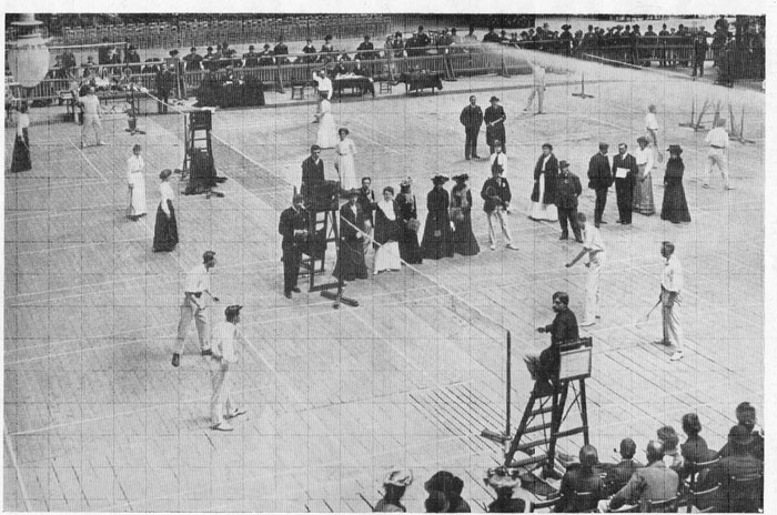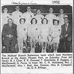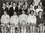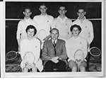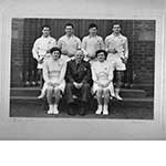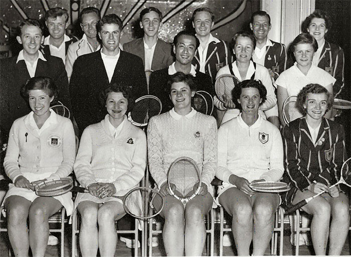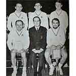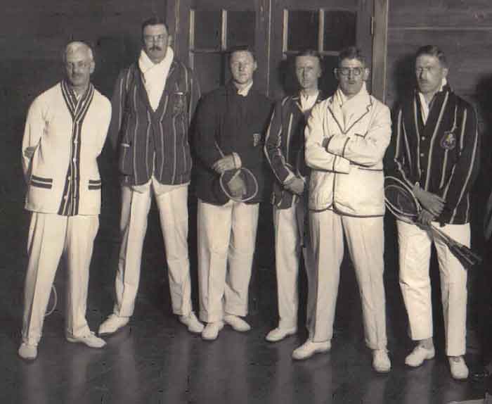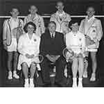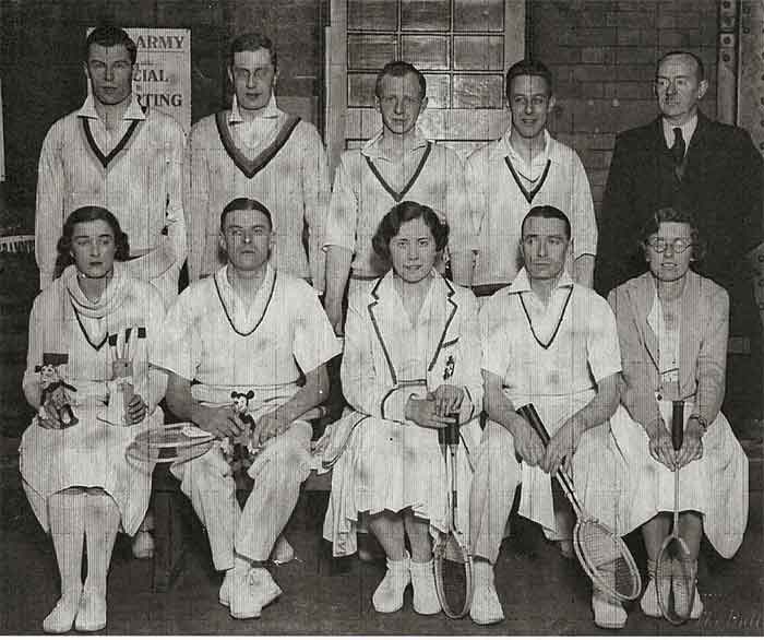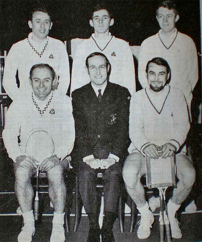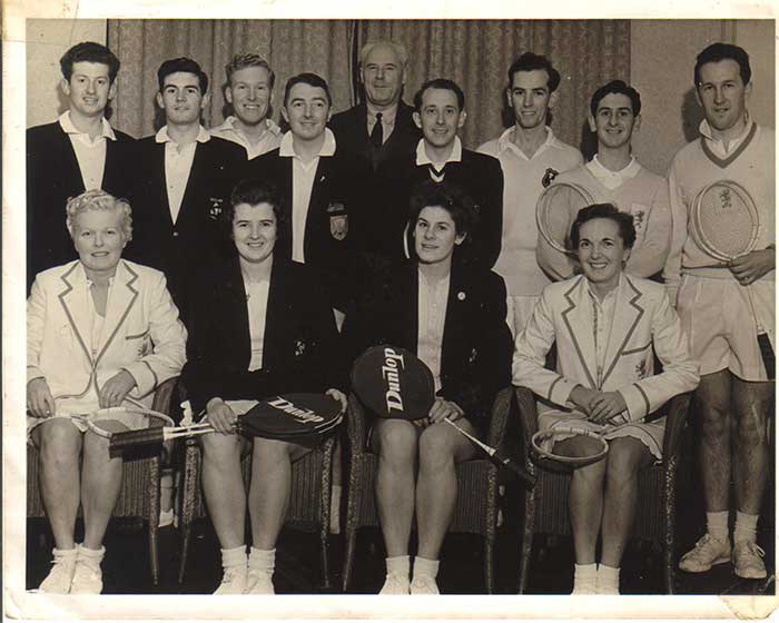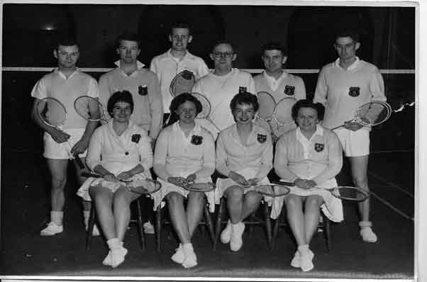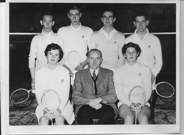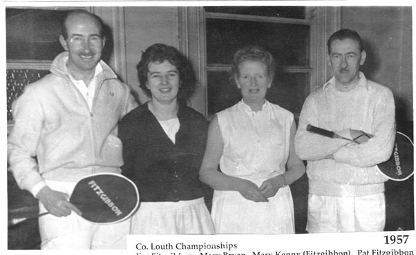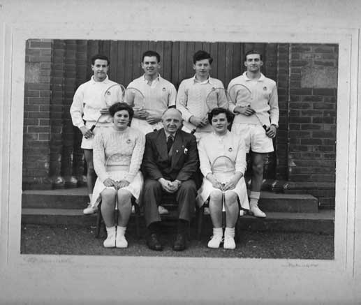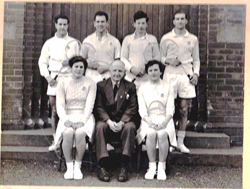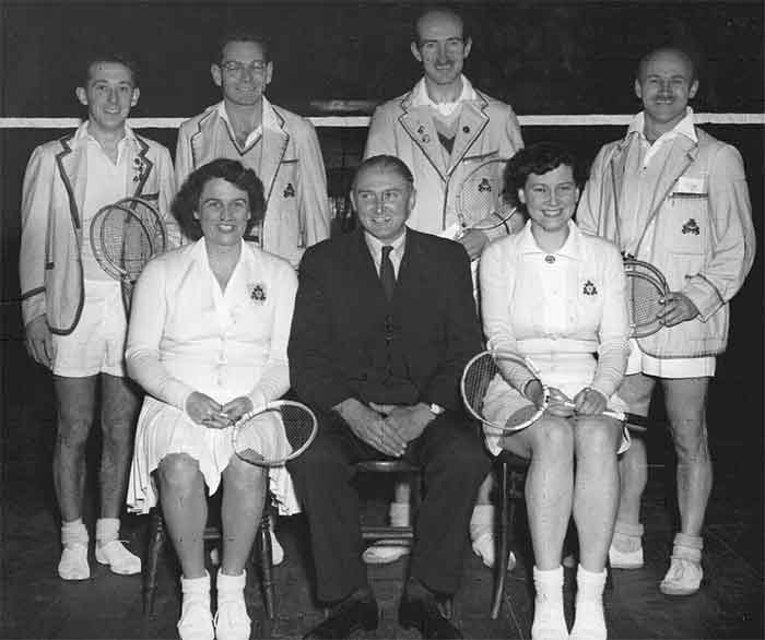 On the extreme right of the picture, standing on Court 1, is Dick Bell, the architect. On Court 2, Olive Byrne serves to Dympna Kilbride, whilst her partner, Ray Billings, looks on. On Court 3, on the extreme left of the picture, is Alan McEachern.